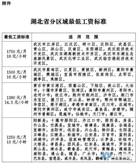 根据2017年9月湖北省政府下发《关于调整全省最低工资标准的通知》,从2017年11月1日起,湖北最低工资标准按照适用地区划分为以下四档: