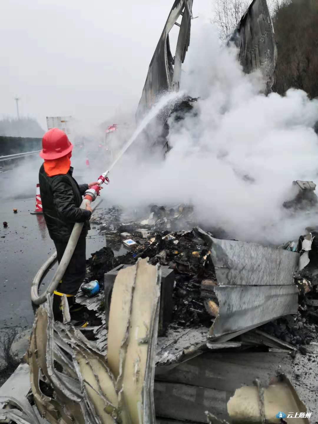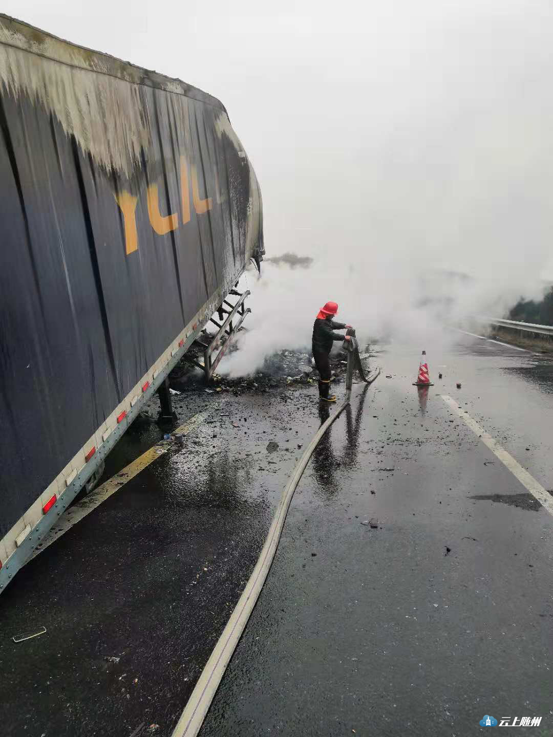 当日7时许,殷店派出所接到报警称:在随岳高速殷店天河口路段入口11公里处一大货车起火。接警后,值班民警带领殷店专职消防队迅速赶到现场。经现场查看,是高速公路上的一辆满载货物的大货车着火。民警迅速做好安全防护措施,维持现场交通秩序并组织开展救援工作。经数小时的扑救,大火被扑灭。因扑救及时,火灾没有造成人员伤亡。后经初步了解,起火原因可能是集装箱内货物自燃引起的。