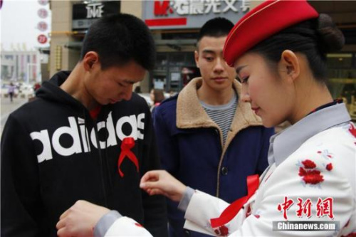 资料图:四川西南航空职业学院的10名准空姐、准空少以“艾滋病患者”的身份,向过往的行人索要拥抱,以此进行“防艾”宣传。毛成山 摄