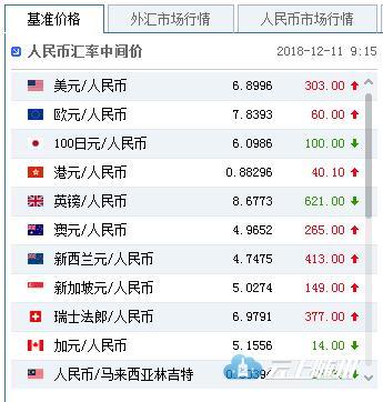 中国人民银行授权中国外汇交易中心公布,2018年12月11日银行间外汇市场人民币汇率中间价为:1美元对人民币6.8996元,1欧元对人民币7.8393元,100日元对人民币6.0986元,1港元对人民币0.88296元,1英镑对人民币8.6773元,1澳大利亚元对人民币4.9652元,1新西兰元对人民币4.7475元,1新加坡元对人民币5.0274元,1瑞士法郎对人民币6.9791元,1加拿大元对人民币5.1556元,人民币1元对0.60394马来西亚林吉特,人民币1元对9.6512俄罗斯卢布,人民币1元对2.0819南非兰特,人民币1元对163.44韩元,人民币1元对0.53188阿联酋迪拉姆,人民币1元对0.54326沙特里亚尔,人民币1元对41.2497匈牙利福林,人民币1元对0.54743波兰兹罗提,人民币1元对0.9521丹麦克朗,人民币1元对1.3169瑞典克朗,人民币1元对1.2401挪威克朗,人民币1元对0.77118土耳其里拉,人民币1元对2.9407墨西哥比索,人民币1元对4.7569泰铢。