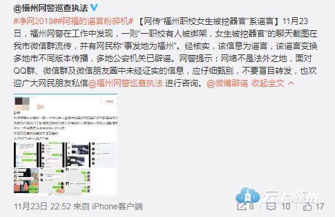 11月23日,福州网警也发布辟谣通报,称网传“福州职校女生被挖器官”系谣言。
