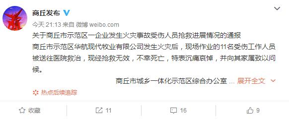 河南省商丘市一工厂17日发生火灾,现场作业的11名受伤工作人员经抢救无效,不幸死亡。火灾发生后,市委、市政府高度重视,立即启动应急预案,市委、市政府主要领导立即赶赴现场指挥抢险救治工作。同时,对事故原因展开调查。
