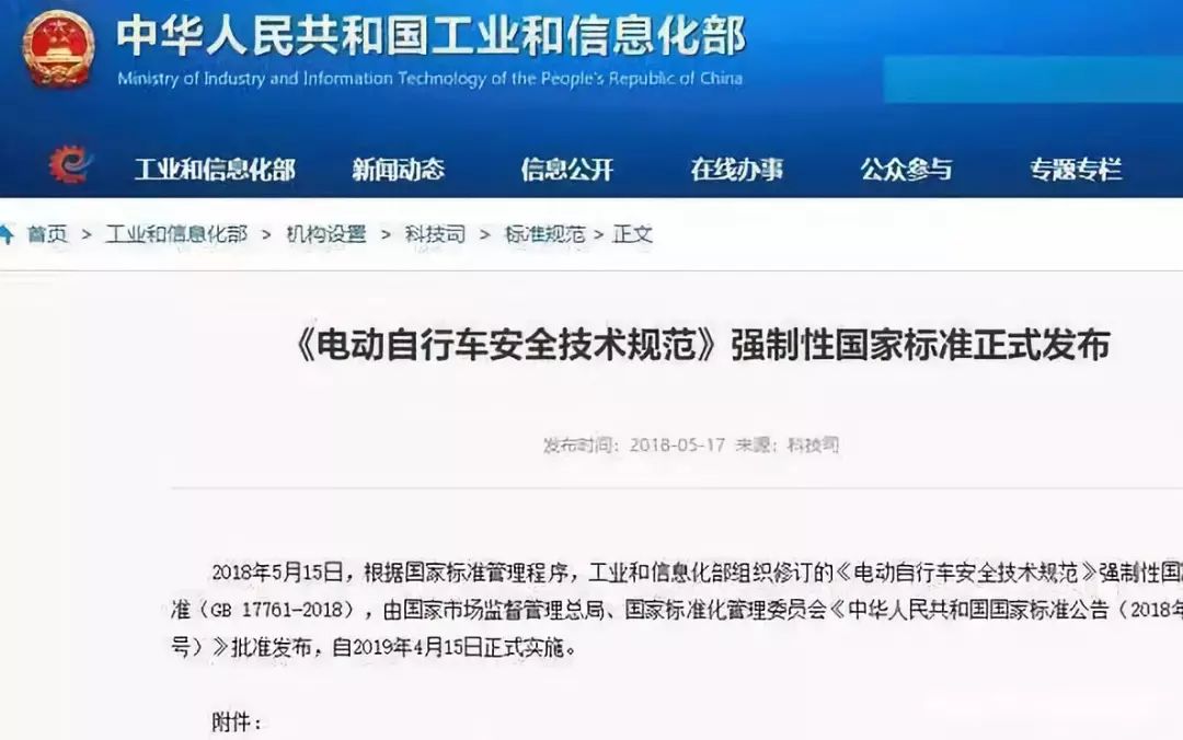 新国标是今年5月份由国家市场监督管理总局、国家标准化管理委员会及工信部等四部门批准发布的《电动自行车安全技术规范》国家标准。新修订的《规范》废除了长达19年的旧规,调整完善了电动自行车最高车速、整车质量、脚踏骑行能力等技术要求,意在保证大众出行安全。