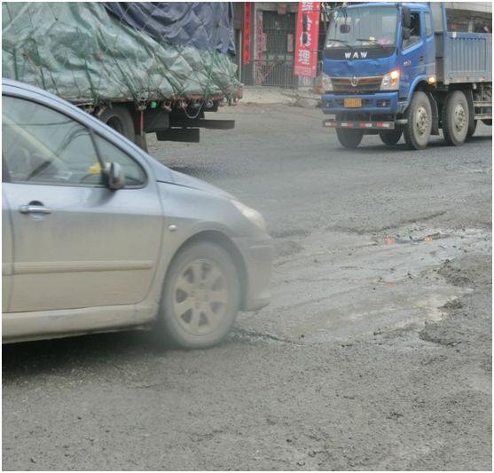 道路凹凸不平、深坑较多、常年积水,导致车辆长期拥堵、事故频发。谨慎慢行!