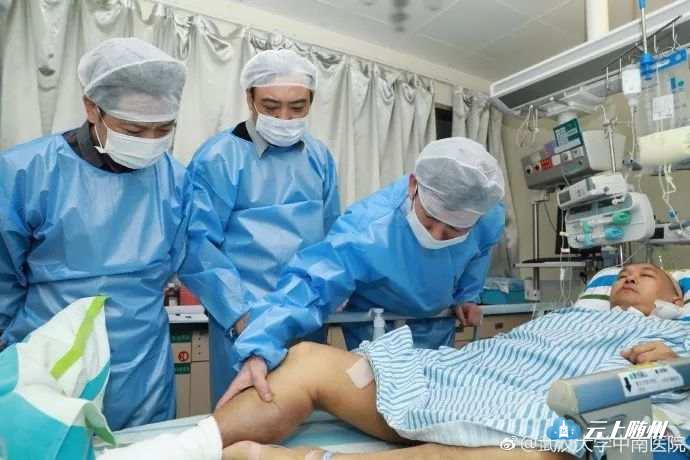 在微博的配图中,张医生平躺在ICU的病床上,双眼睁开意识清醒,中南医院院长、泌尿外科首席专家王行环、神经外科教授陈劲草等专家在为他检查身体。