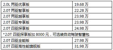 两驱智享版,入门即高配:全LED前大灯、1.23平米全景天窗、9AT、四轮独立自适应减震系统、8.4+7英寸双液晶人机交互、倒车雷达及影像带刹车辅助、真皮座椅、胎压监测显示…安全/舒适/操控一应俱全。