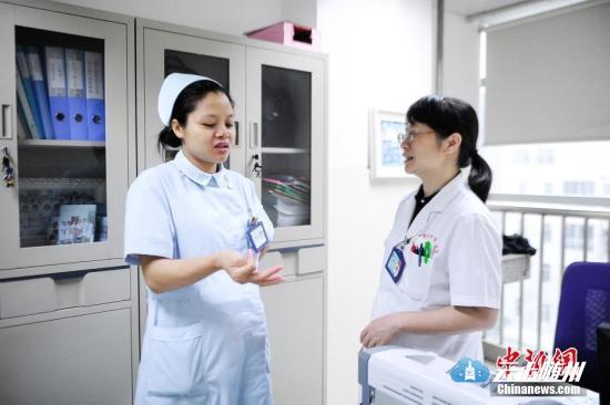 图为葛莉萍与怀孕的护士田思连在交流。该护士已怀孕9个月,即将生产。刘梦璇 摄