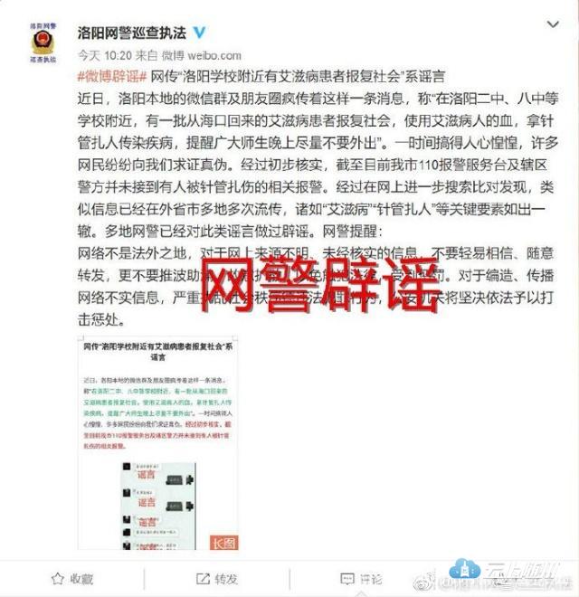 今日,网警蜀黍接到网民举报,称我市微信群及QQ群流传着这样几条消息:“艾滋病患者报复社会,在随州二中、八中附近及202公交上,拿针管扎人传染疾病”、“随州街上有人掏肾”等。经核实,目前我市并未接到类似报警,经网上搜索发现,该信息系老谣言,在全国各地被修改地名后流传,已被多地网警辟谣。警方提醒:网络不是法外之地!请广大网友不信谣、不传谣、不造谣,网上遇可疑信息时,及时通报公安机关网警部门,让谣言止于智者,依法上网、文明上网。