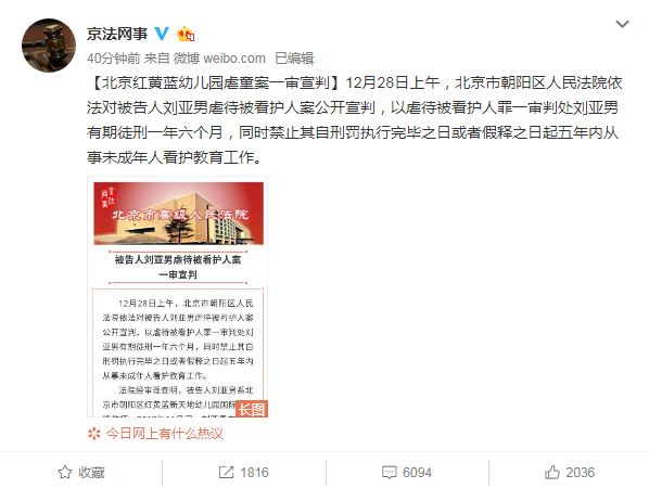 12月28日上午,北京市朝阳区人民法院依法对被告人刘亚男虐待被看护人案公开宣判,