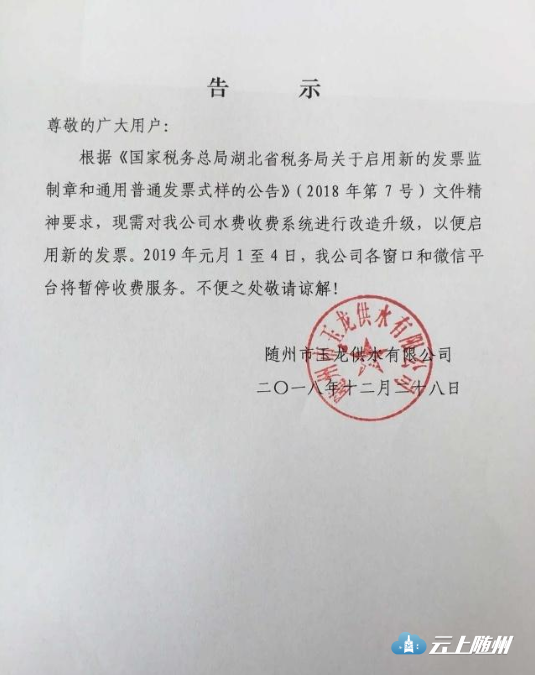 ▶2019年1月1日至4日,玉龙供水公司将暂停各窗口和微信平台收费服务。