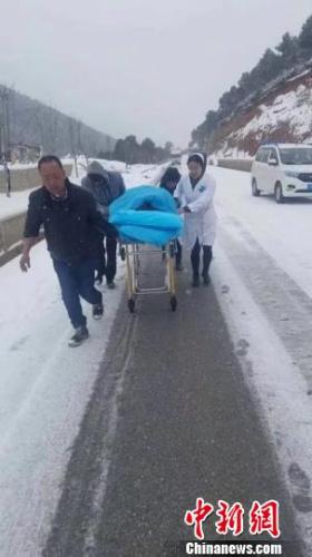 医护人员在现场实施初步诊断后,在风雪中推着担架又往返3里多路,把孕妇护送上救护车,当日16时30分顺利送达香格里拉市妇幼保健院。
