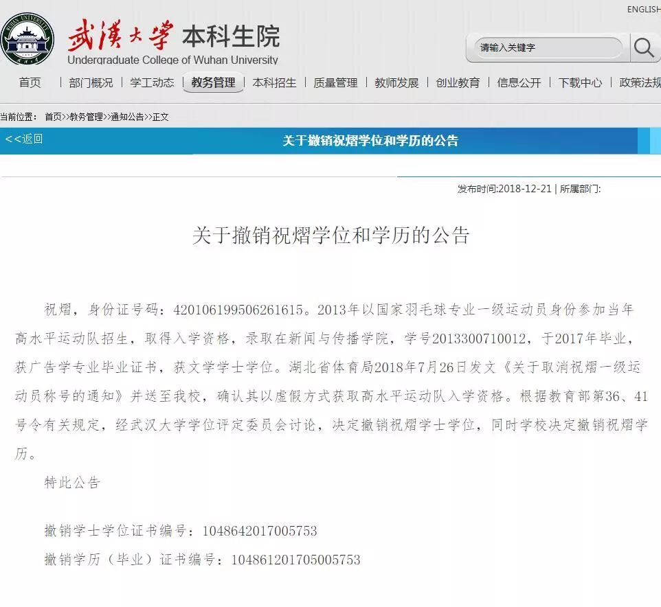 日前,武汉大学本科生院网站发布了《关于撤销祝熠学位和学历的公告》。公告提到了撤销武大2013级毕业生祝熠学位和学历的原因及依据。