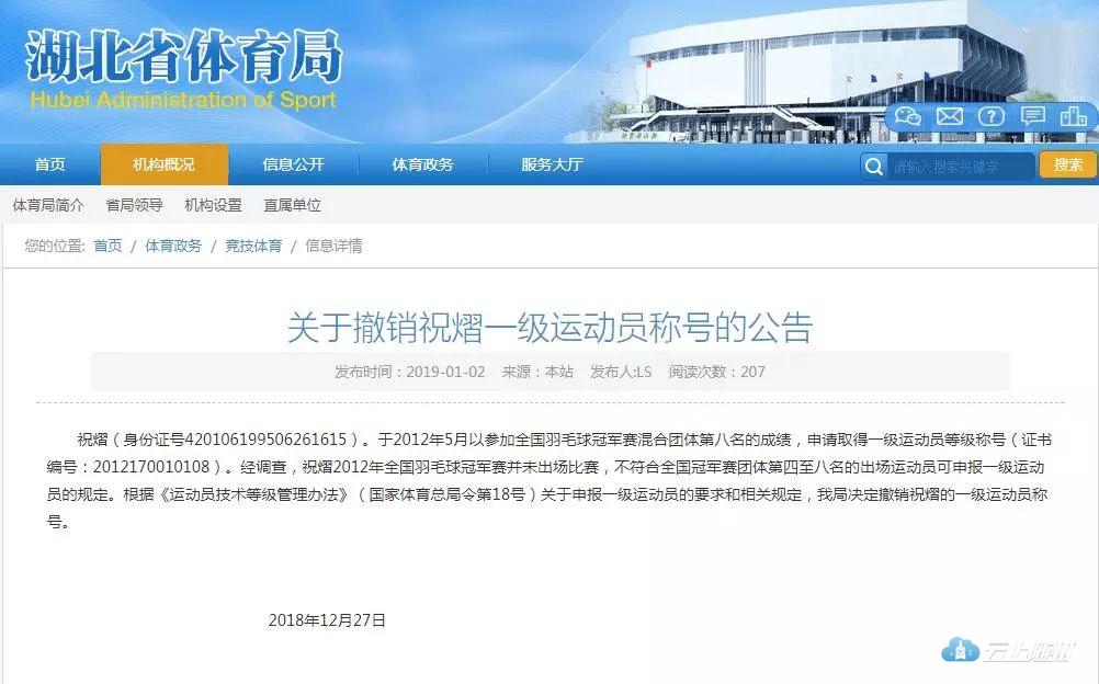 查阅湖北省体育局官网发现,1月2日,该局官网发布了《关于撤销祝熠一级运动员称号的公告》。