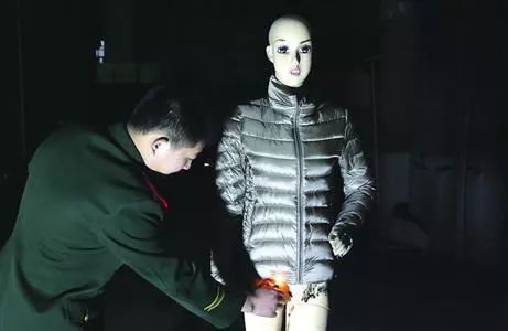 羽绒服穿在假人模特身上拉上拉链,记者拿打火机在衣服下摆一角刚一点火,羽绒服马上蹿出火苗,火势慢慢扩大、蔓延。不到5分钟,整件羽绒服就被烧得精光,连拉链也被烧得完全熔化了。