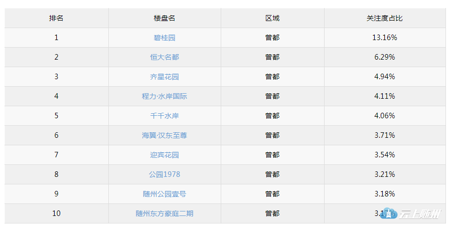 2018年,随州楼盘关注度最高的是碧桂园,关注度占比为13.16%,恒大名都排名位列次席,关注度占比为6.29%,齐星花园位列第三位,关注度占比为4.94%。