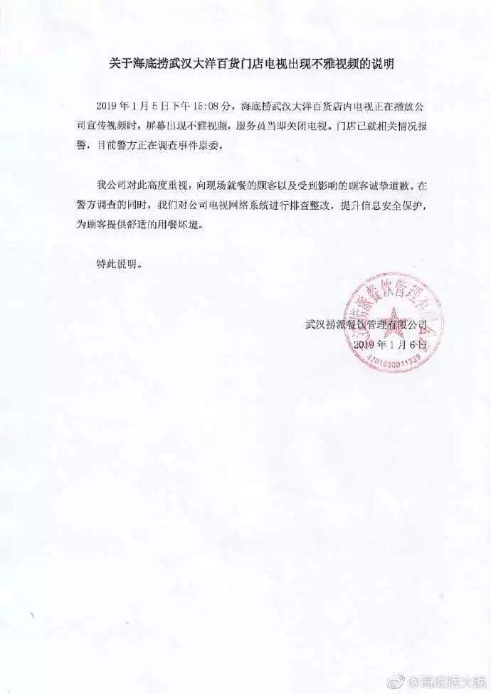 武汉海底捞发布说明称,已就相关情况报警,警方正在调查,并向顾客致歉,对公司电视网络系统排查整改。