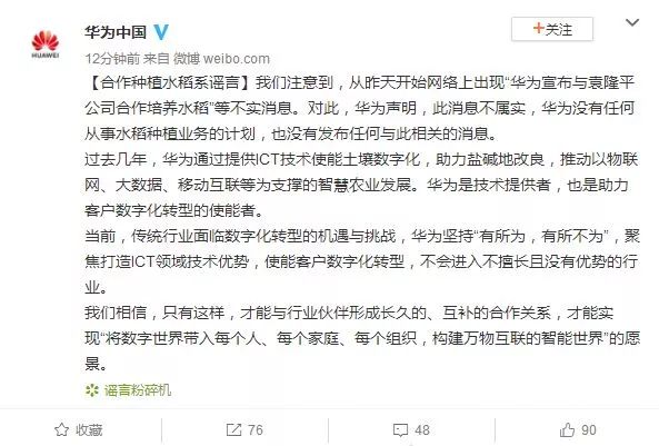 “我们注意到,从昨天开始网络上出现‘华为宣布与袁隆平公司合作培养水稻’等不实消息。对此,华为声明,此消息不属实,华为没有任何从事水稻种植业务的计划,也没有发布任何与此相关的消息。”华为在提供给澎湃新闻的一份声明中称。