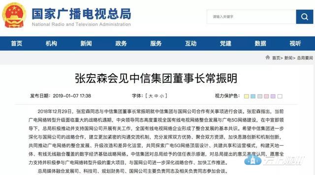 2018年以来,国家广播电视总局局长、党组书记聂辰席先后会见了移动、联通、电信三大运营商董事长时提到,立足各自优势,加强业务融合,打通广电网络与互联网资源,促进荧屏声频与网络视听应用、广播电视终端与移动通讯终端互动融通,努力实现差异化发展。
