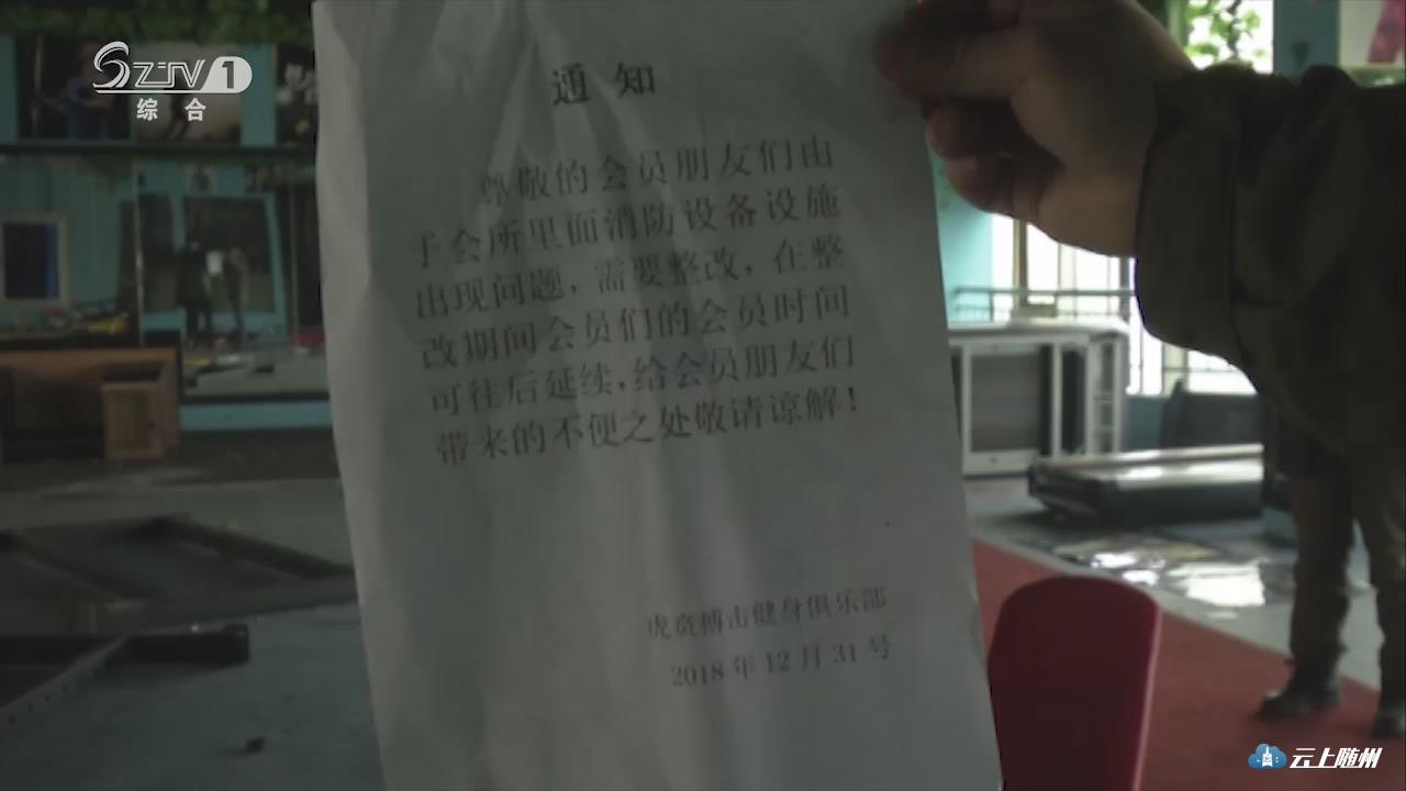 在健身房的地上,记者捡到了一张落款为虎贲搏击健身俱乐部在2018年12月31号发布的公告,称健身房由于消防设施未达标,将进行整改,会员时间可往后延续。记者联系到了健身房场地所属单位,相关负责人介绍,健身房实际到期日期为2018年10月底,目前暂未续约。随后,记者也电话联系了健身俱乐部的负责人了解情况。