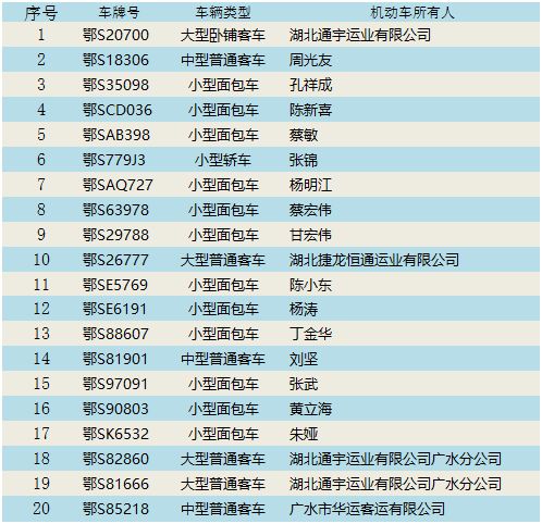 湖北省交管局按照国家九部委《关于全力做好2019年春运工作的意见》和公安部要求,梳理了我省不符合参加2019年春运条件的客车及驾驶人或是状态为逾期未检验、逾期未报废的公路客车、旅游客车或是记满12分的湖北籍A1、A2、B1证驾驶人的清单公布如下: