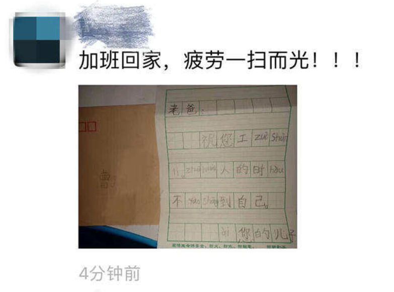 老曹打开手机发了一条朋友圈,“加班回家,疲劳一扫而光”,配图是儿子写给他的书信。