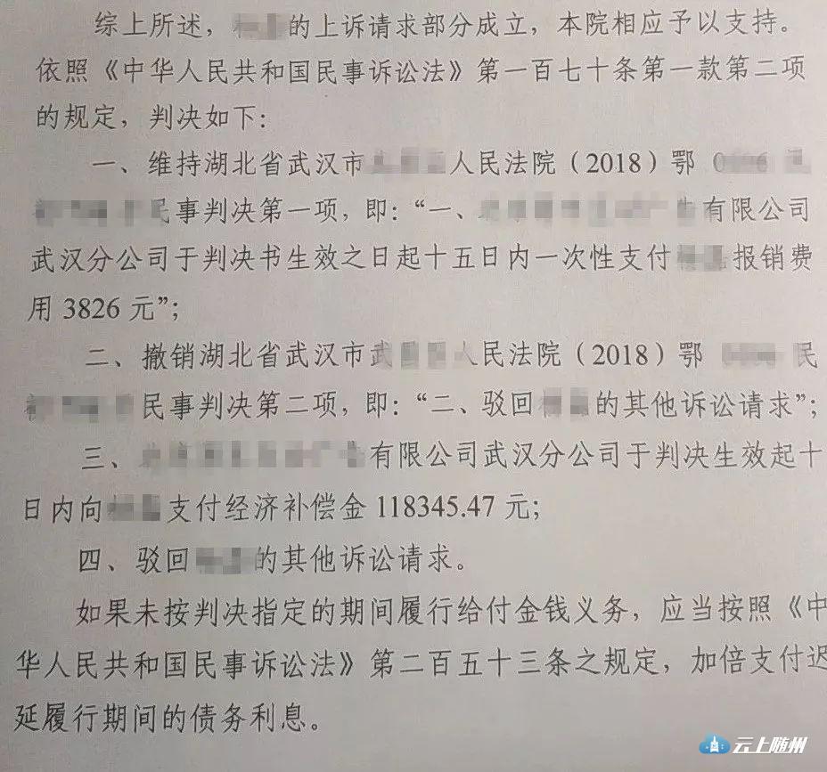 2018年8月3日,武汉市中级人民法院做出终审判决,判令公司一次性支付谢某报销费用3826元,并向谢某支付经济补偿金118345.47元。