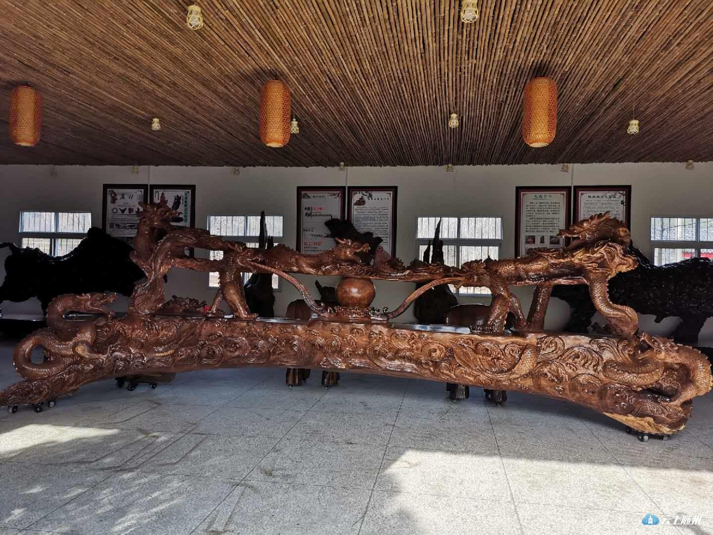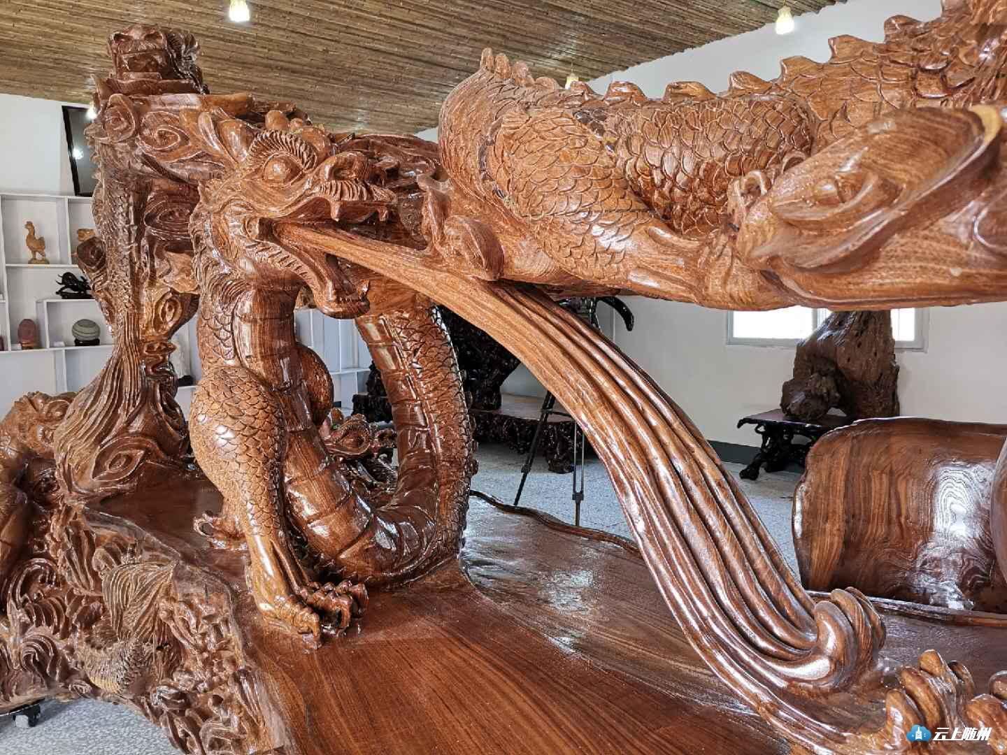这是一件集艺术性和实用性为一体的大型根雕作品,长6米、高2米,重5吨有余,分上中下三层,为镂空雕。上层有云纹和龙头,寓意龙腾祥云,国泰民安;中层为茶台和龙身,寓意承上启下,浑然一体;下层为水纹和龙尾,寓意龙游四海,泽润万物。据公司总经理薛国旺介绍,他小时候得了小儿麻痹症,右腿落下残疾,高中毕业后赋闲在家,从那时起爱上了根雕艺术1979年至今,薛国旺痴迷根雕艺术近40年,每年创作根雕作品近千件,其中“昭君出塞”等200多件根雕作品漂洋过海,远销到美国、日本、韩国和东南亚等国家和地区,深受市场欢迎,好评如潮。
