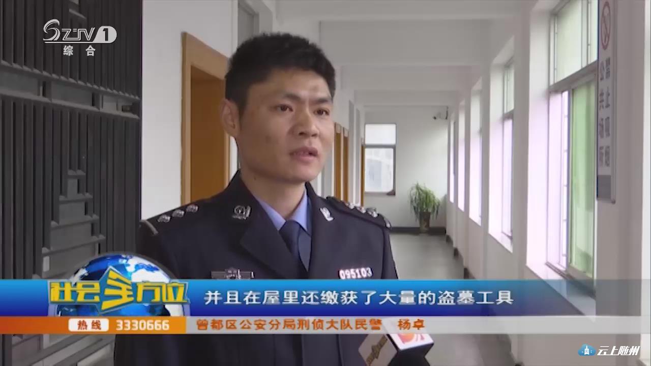 在曾都公安刑侦大队,办案民警向记者展示了盗墓团伙使用的相关工具和查获的文物。办案民警介绍,其中一起案件是曾都区东城义地岗居民自2018年11月以来,多次在周边菜地等偏僻处发现可疑孔洞,因该处系文物保护区,古墓葬分布密集,居民遂向文物保护部门报告,经曾都刑侦大队勘测发现多个新鲜盗洞。