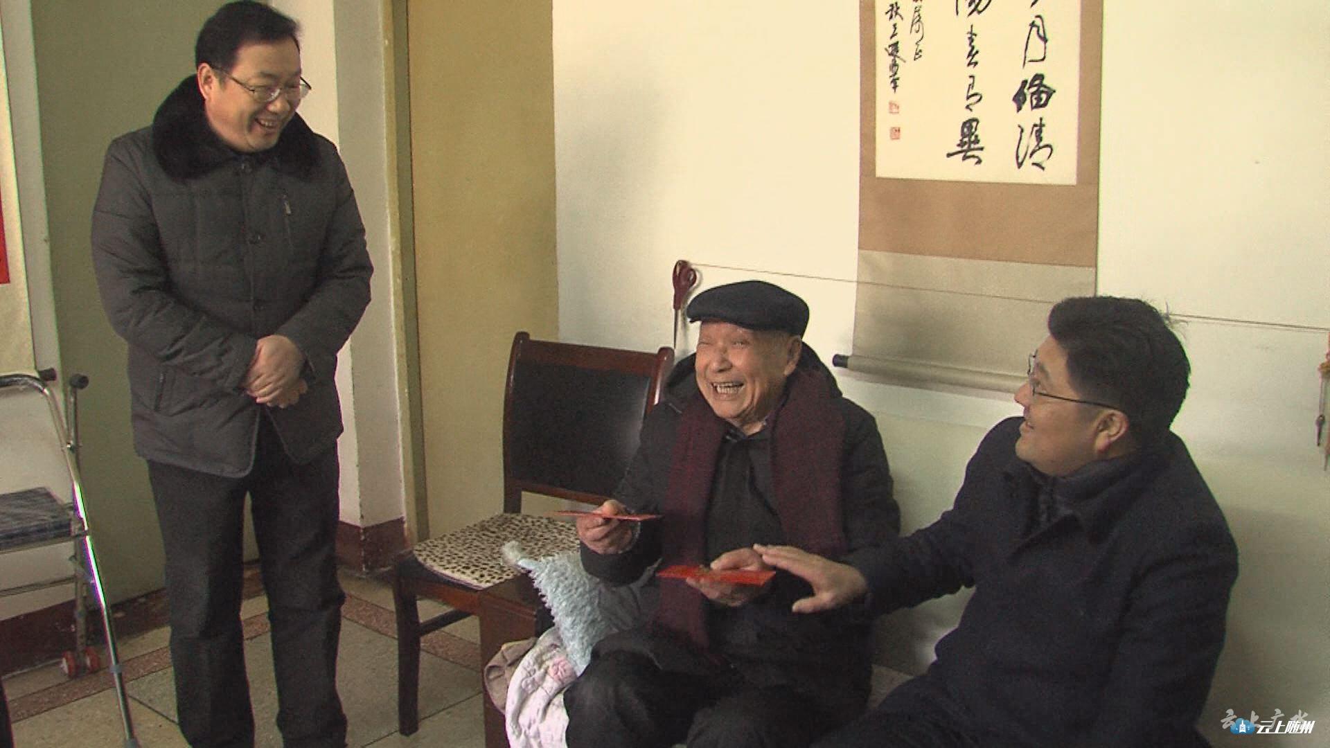 在广水市著名书法家魏大同老先生家中,黄继军拉起他的手围坐在一起,拉家常,话发展。黄继军说,以魏大同老先生为代表的各界老领导对广水市委市政府工作大力支持,发挥余热。去年一年,广水全市各项事业发展稳中有进,收获满满,成果丰硕;重点工程推进有序,面积1500多亩的印台山文化生态园建成开园,广悟大道竣工通车,一批美丽乡村脱颖而出,全年经济指标顺利完成,财政收入较去年增长11.6%, GDP增长7.7%—7.8%,农民人均纯收入跟经济发展同步,脱贫攻坚工作三次顺利迎接国家扶贫检查。当听到广水事业发展欣欣向荣、城区面貌日新月异时,已有92岁高龄的魏老激动不已。