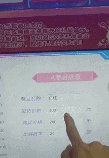 有店铺给记者发来了口红机后台管理讲解视频。在“游戏参数设置”一栏,游戏币数设置显示:多少币玩一局,讲解人员介绍一般是10币一局,1币一元;游戏难度同样可以调节。