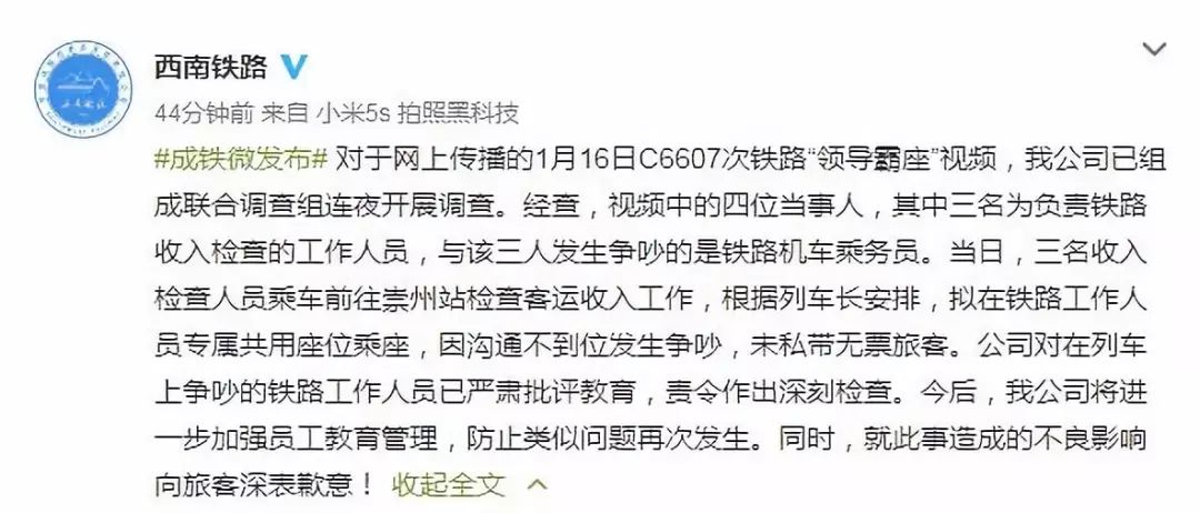 1月17日,中国铁路成都局集团有限公司官方微博@西南铁路 回应“领导霸座”视频,全文如下:
