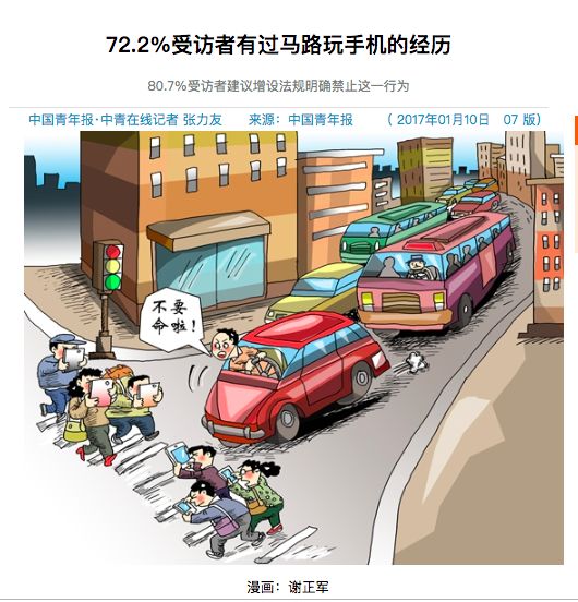 一项调查显示,72.2%的受访者有步行过马路玩手机的经历,步行过马路时从不玩手机的受访者仅占27.8%。