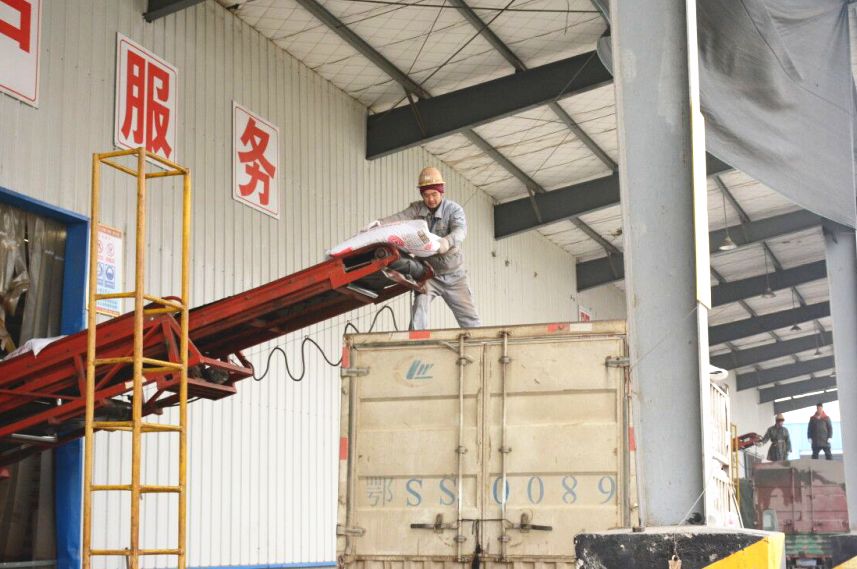 正大饲料(随州)有限公司的大门前,七八辆大型卡车排着队等待送料进厂。公司的仓库出口,一排货车正排队装货,车辆进进出出,很是红火。