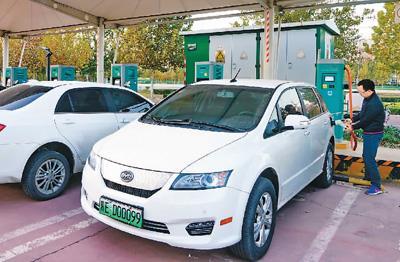 河北省邢台市民在电动汽车充电站充电。 新华社记者 杨世尧摄