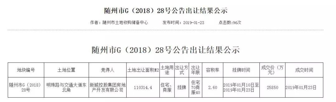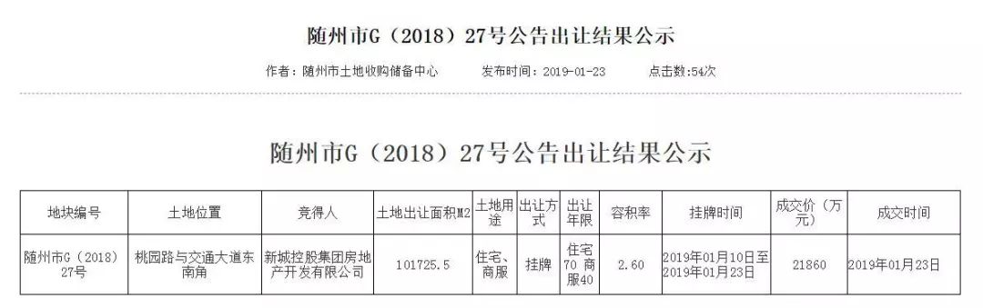 2019年1月23日上午,随州市G(2018)27号、G(2018)28号两宗国有土地出让挂牌竞拍结束,大型品牌房企新城控股集团旗下公司——新城控股集团房地产开发有限公司以4亿7710万元的总价成功摘牌。这意味着,新城控股正式进驻随州,将为曾都推进“品质随州示范区”建设添砖加瓦。同时,随州新城吾悦广场将打造集城北商业中心、精品住宅为一体的城市综合体项目,推动明珠新城建设。