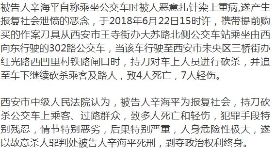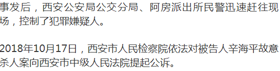 2019年1月25日上午10时许,西安市中级人民法院公开开庭宣判了被告人辛海平故意杀人一案,以故意杀人罪判处被告人辛海平死刑,剥夺政治权利终身。