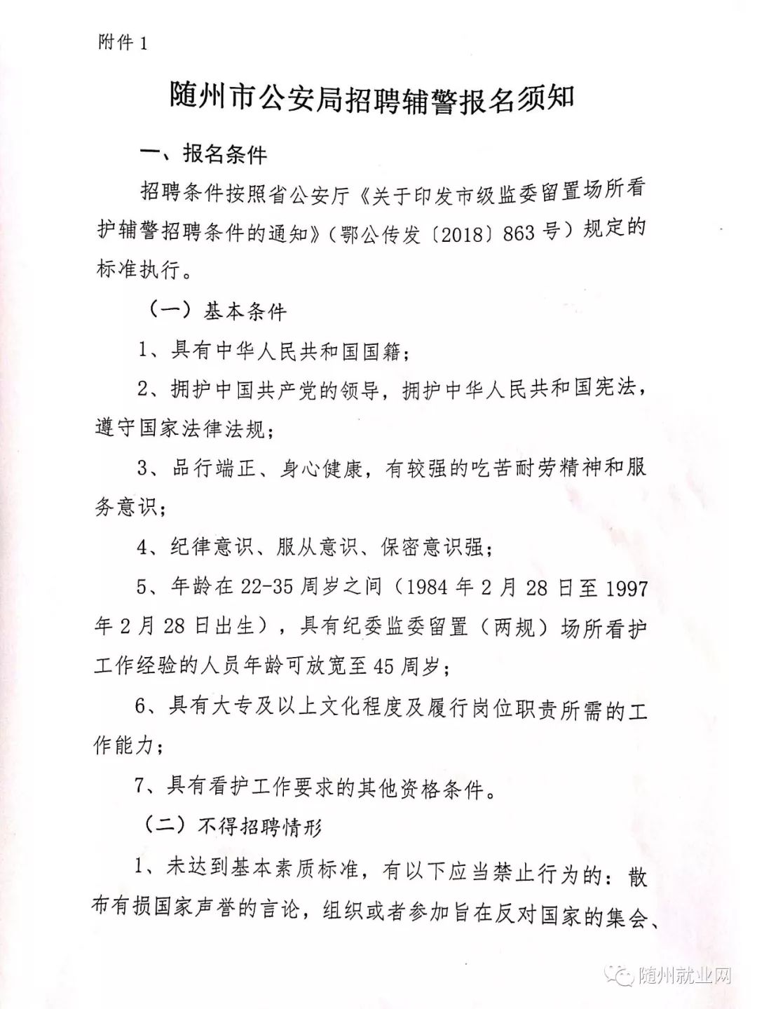 招聘条件按照省公安厅《关于印发市级监委留置场所看护辅警招聘条件的通知》(鄂公传发〔2018〕863号)规定的标准执行。