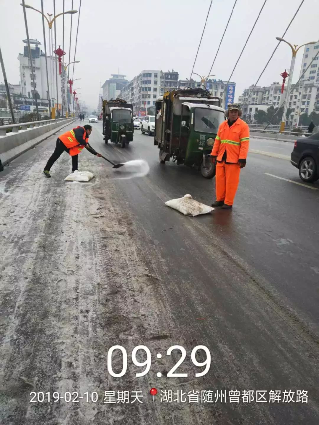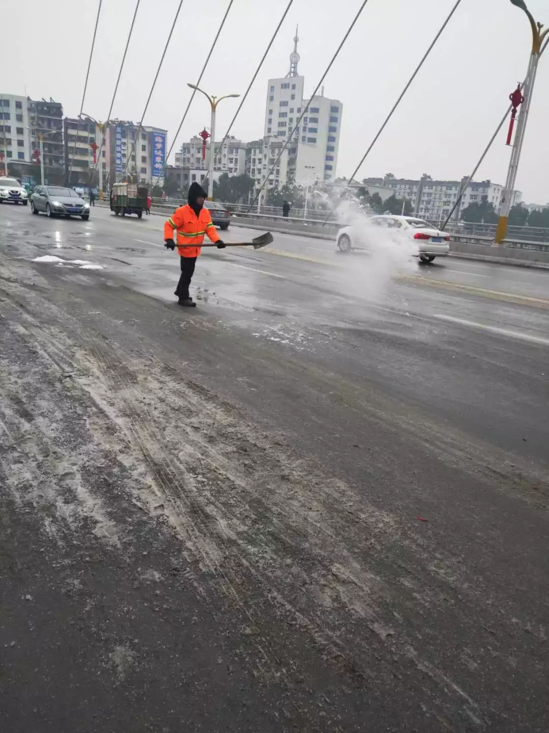 风雪中,当大家都在加快回家的步伐时,环卫工人在清扫完包保路段后,奔赴㵐水一桥、㵐水二桥、涢水一桥、青年路大桥、十字街人行天桥等地,清扫桥面积雪,铺撒工业盐,防止桥面结冰,全力确保市民出行畅通,过一个安全、祥和的春节。