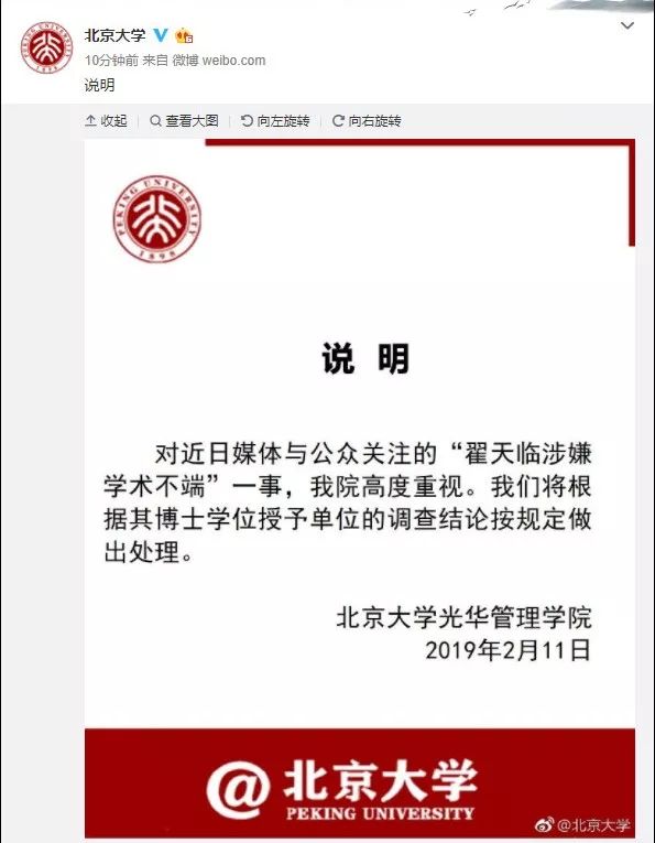 2月11日22点43分,@北京大学 官方微博发布说明:对近日媒体与公众关注的“翟天临涉嫌学术不端”一事,我院高度重视。我们将根据其博士学位授予单位的调查结论按规定做出处理。