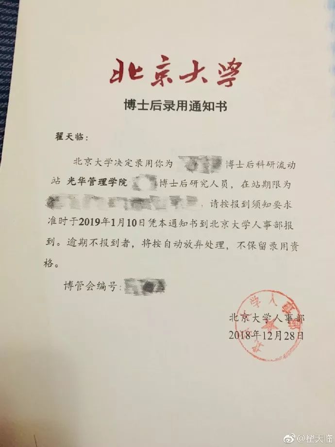 前不久,演员翟天临刚刚晒过了北京大学光华管理学院的博士后录用通知书。这位拥有北京电影学院电影学博士学位的演员,已经站在了整个娱乐圈的学历之巅。