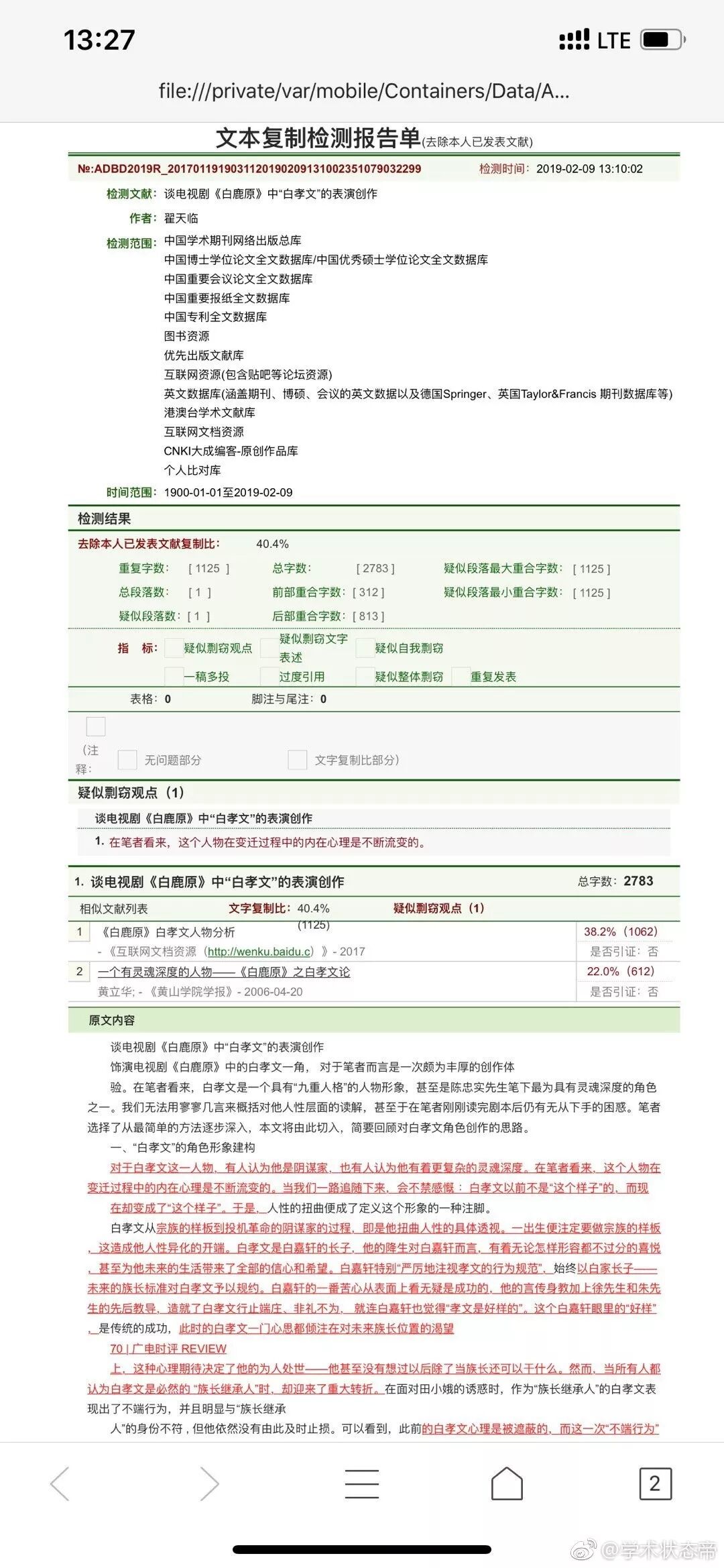 由于他的《谈电视剧<白鹿原>中“白孝文”的表演创作》一文的查重检测报告显示相似度超过50%、知网上文字重复比为40.4%,总字数2783的文章中重复字数多达1125个。