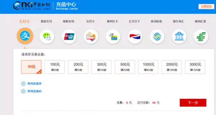 充值中心提供了支付宝、微信、银联在线等不同的充值方式,但针对不同充值方式设置了数额不等的最低充值金额限制。 小刘为下载7元的文献,于是充值50元。