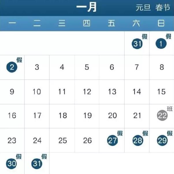 二、春节:1月27日至2月2日放假调休,共7天。1月22日(星期日)、