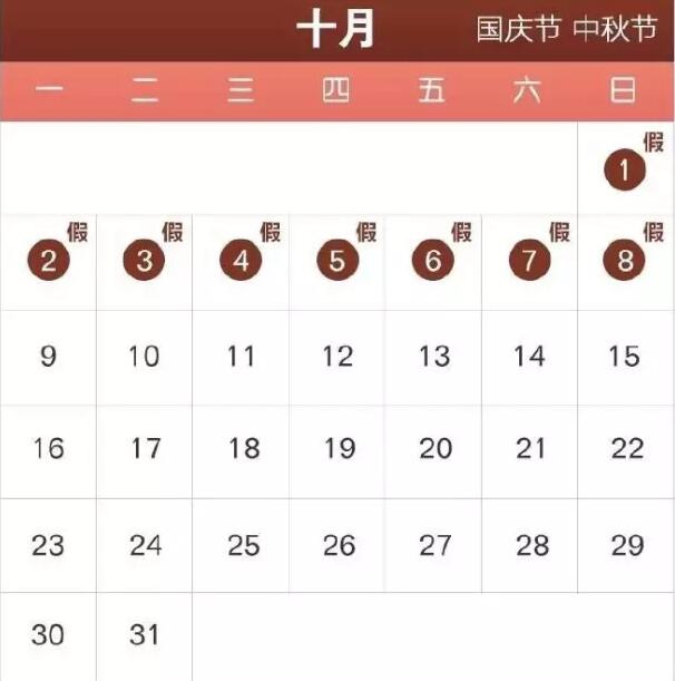 六、中秋节、国庆节:10月1日至8日放假调休,共8天。9月30日(星期六)上班。