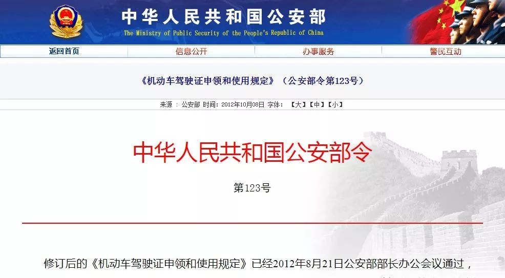 在公安部官方网站上,查询到最新发布的是《机动车驾驶证申领和使用规定》(公安部令第123号)