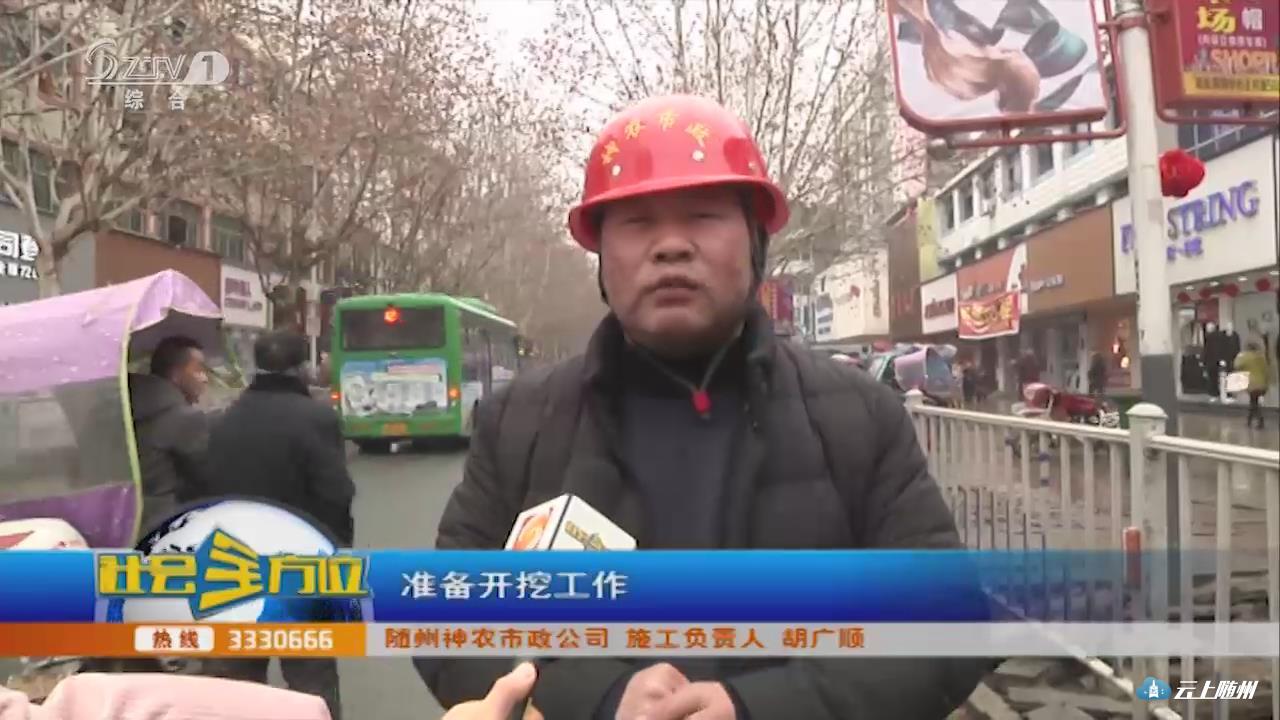 【解说】工作人员告诉记者,此次实行半封闭式施工,施工路段只允许车辆从舜井大道往烈山大道方向单向通行,调整后的公交路线已经在随州日报等多个媒体上公布。随后,记者来到解放路的施工路段,看见部分施工路段已经用蓝色的挡板围住,工人们正在对没有围挡的路面进行破拆,并将拆掉的石板搬运到一辆蓝色小货车上,准备将石板运走,用挡板进行围挡。