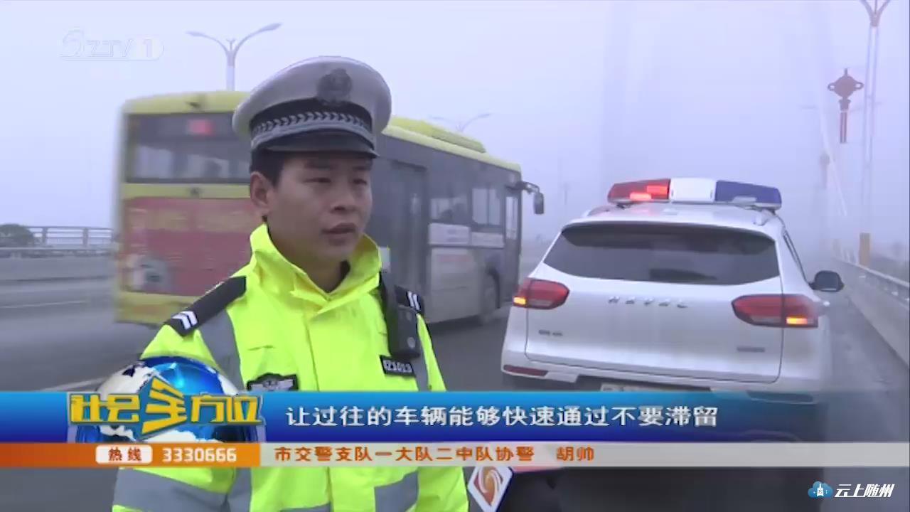 【采访】 市交警支队一大队二中队协警 胡帅:提醒广大司机,在遇到大雨大雪大雾的这样的恶劣天气,一定要谨慎驾驶,当遇到交通事故,一定要及时打开车子双闪灯,并在车辆后方放置三角标,把车上的人员尽快的疏散转移到安全地带,并及时拨打报警电话,尤其是这样的恶劣天气,一定不要让家里的老人单独外出,以保证他们的安全。