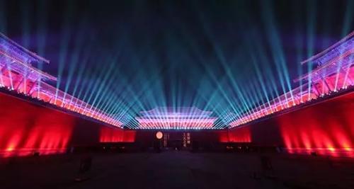午门城楼及东西雁翅楼用百、黄、红三种颜色装扮。太和门广场也变成了超大的夜景灯光秀场。故宫的“网红”藏品《清明上河图》《千里江山图卷》也在“灯会”中展开画卷。
