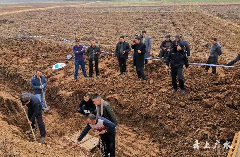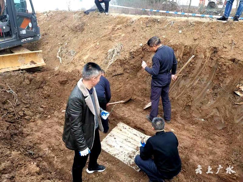 关庙镇政府迅速安排文化站及派出所民警赶到现场进行保护。得知这一信息后,广水市文体新广电局立即组织文物部门工作人员赶到,并由考古人员进行发掘。