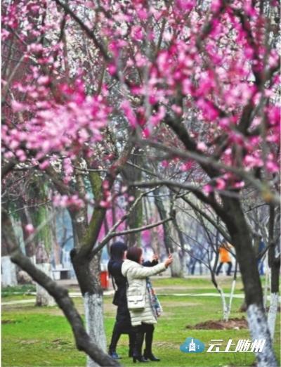 青山公园,两位女士在梅花树下自拍,怡然自乐记者李永刚 摄